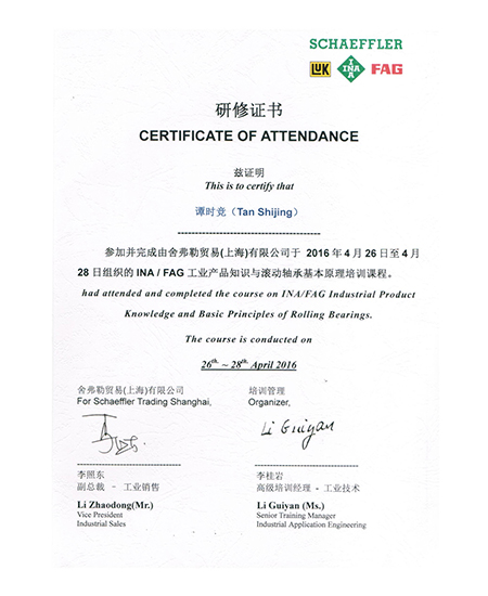 譚時競2016年舍弗勒培訓(xùn)研修證書